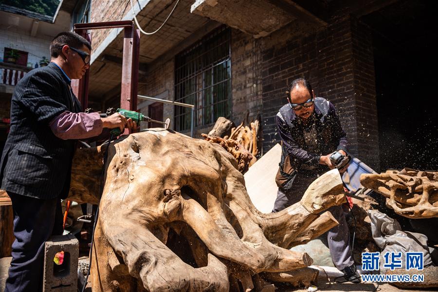 5月18日,刘德付(右)在工艺厂内加工木料。 新华社记者 陶亮 摄