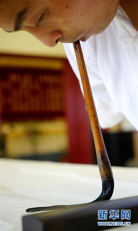 在江西省南昌市残疾人书法家协会的活动场地,蔡沐江口衔毛笔写字(5月16日摄)。 新华社记者 彭昭之 摄