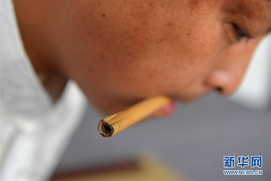 由于常年口衔毛笔练字,蔡沐江使用的毛笔经常被咬坏(5月18日摄)。 新华社记者 彭昭之 摄