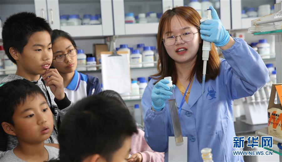5月19日,孩子们在位于山东省青岛市的中科院海洋所内观看科研人员做实验。 2019年全国科技活动周于5月19日启动,各地举行了丰富多彩的活动,让人们零距离感受科技的魅力。 新华社发(张进刚 摄)