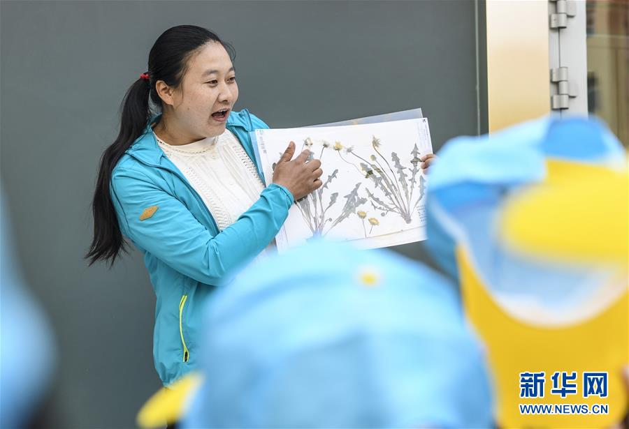 5月19日,在中国科学院新疆生态与地理研究所标本馆,工作人员曹秋梅向前来参观的小朋友讲解标本制作方法。 新华社记者 王菲 摄