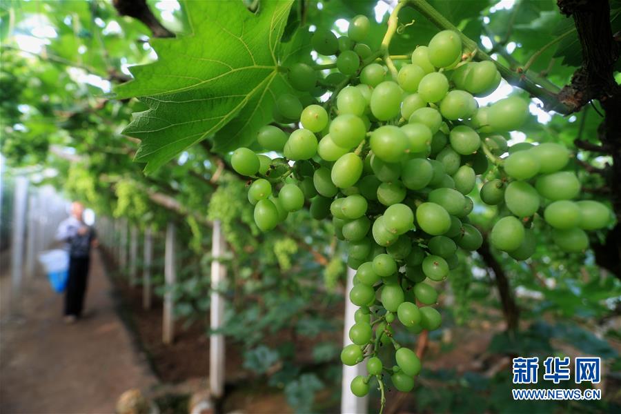 5月19日,在河北省唐山市海港经济开发区王滩镇赵滩村,村民在管理大棚葡萄。 新华社发(李磊 摄)