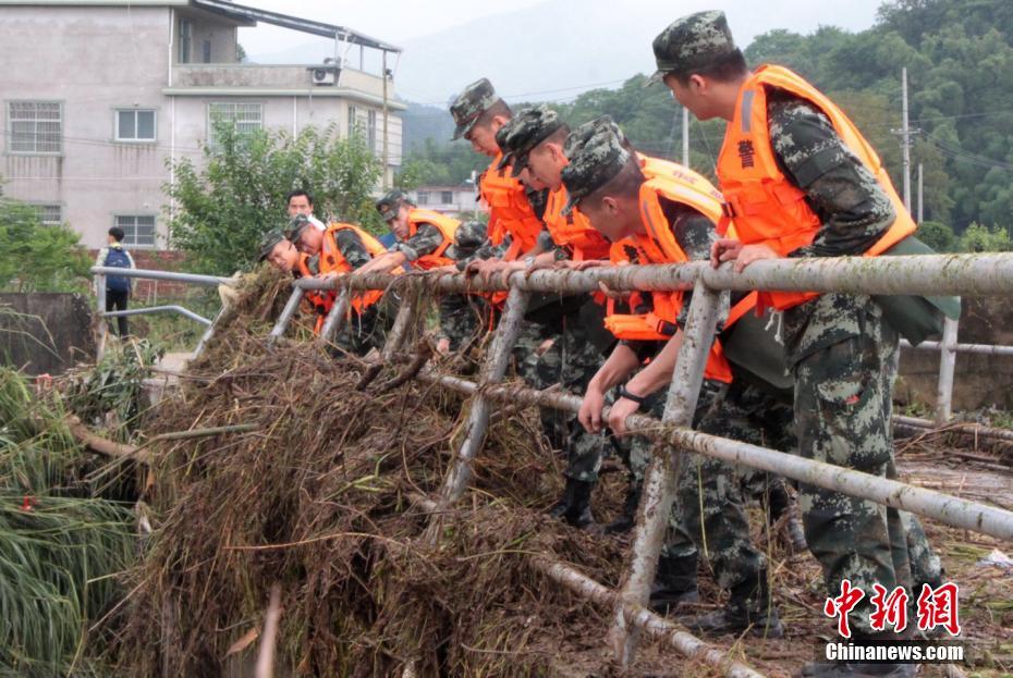 5月17日至18日,强降雨造成福建省龙岩市多地山洪暴涨、民房进水、乡村道路受阻、农作物受淹。武警福建省总队龙岩支队派出167名官兵,连夜赶往连城、长汀、武平县支援抗灾救灾工作。经过连续十几个小时的奋战,官兵将连城县北团镇上江村受灾桥面险情清除,清理道路淤泥1公里,并为多处进水房屋清理屋中淤泥、转移物资,保障了村民的财产安全和出行畅通。图为官兵清除受灾桥面险情。 张斌 摄