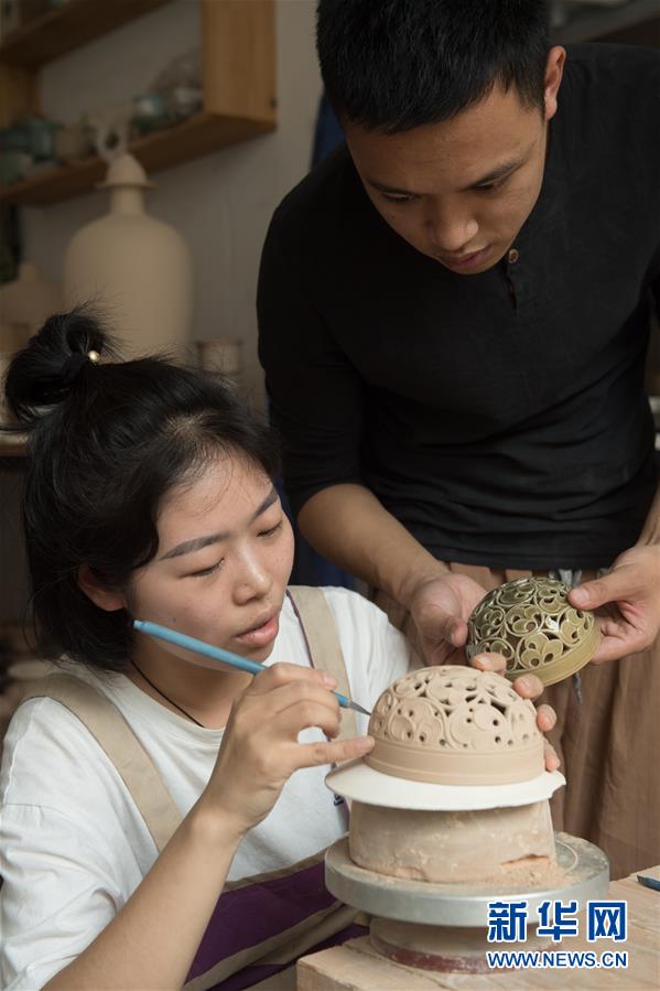 5月20日,林松(右)和妻子季静在工作室讨论一款香炉盖的镂刻效果。 林松,1993年出生于浙江龙泉市大窑村。在古窑边玩耍长大的他在龙泉和景德镇接受了陶瓷专业教育,并跟随青瓷艺人学习多年。2014年林松在故乡龙泉开设了林松青瓷工作室,专注于古香炉的复刻。目前,林松共收藏了四五十款古龙泉香炉标本,并已复刻了二十多款。 摹古并不容易。林松说,要复刻古器物的精气神,从胎到釉到形都得细细琢磨,在烧成上反复尝试。他从古窑址旁取土制作胎釉原料,并在大窑村老家旁建起柴窑,希望通过努力捕捉到古龙泉青瓷的气韵。 新华社记者 翁忻旸 摄