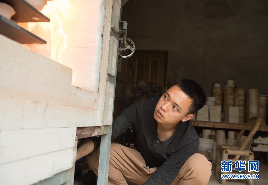 5月20日,林松给他的气窑开火,烧制一批青瓷器。 林松,1993年出生于浙江龙泉市大窑村。在古窑边玩耍长大的他在龙泉和景德镇接受了陶瓷专业教育,并跟随青瓷艺人学习多年。2014年林松在故乡龙泉开设了林松青瓷工作室,专注于古香炉的复刻。目前,林松共收藏了四五十款古龙泉香炉标本,并已复刻了二十多款。 摹古并不容易。林松说,要复刻古器物的精气神,从胎到釉到形都得细细琢磨,在烧成上反复尝试。他从古窑址旁取土制作胎釉原料,并在大窑村老家旁建起柴窑,希望通过努力捕捉到古龙泉青瓷的气韵。 新华社记者 翁忻旸 摄