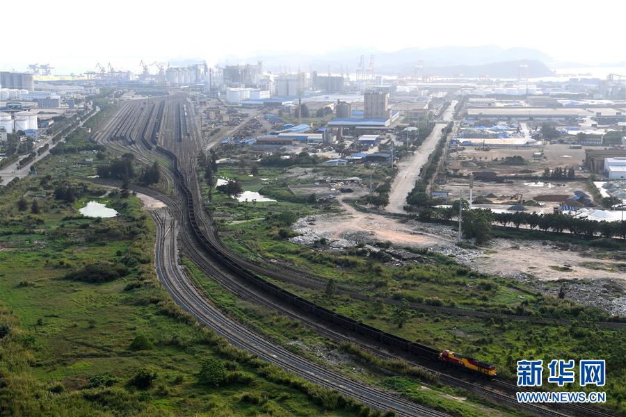 一列货车从防城港港口码头的铁路上驶出(4月10日摄)。 新华社记者 周华 摄