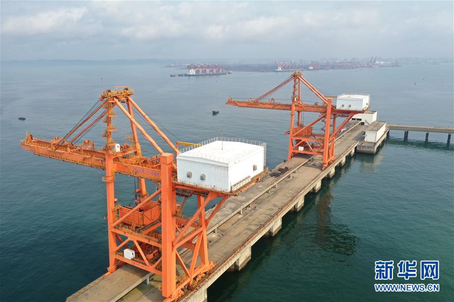 这是广西钢铁集团防城港钢铁基地项目20万吨码头主体工程(4月11日无人机拍摄)。 新华社记者 周华 摄