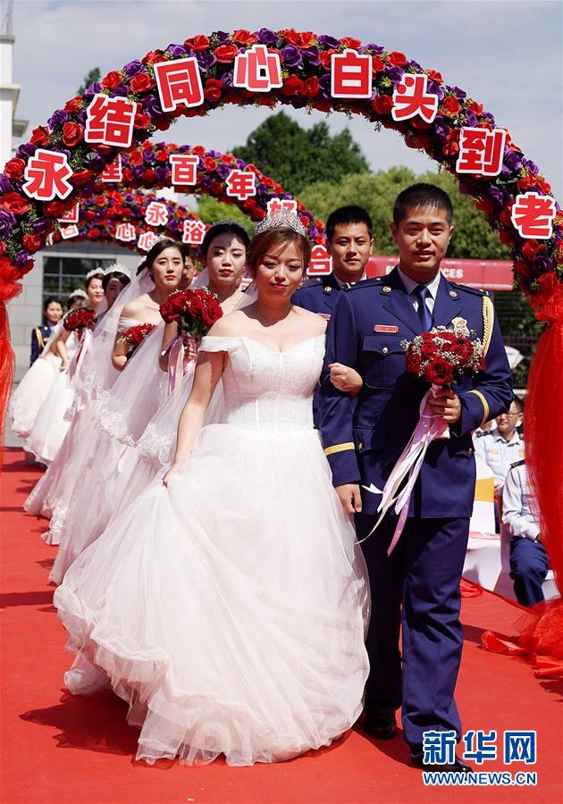 5月20日,参加集体婚礼的消防员与爱人一同走上红毯。 当日,上海市普陀区消防救援支队举行“相约红门,爱在消防”集体婚礼,8对新人参加。 新华社记者 陈飞 摄