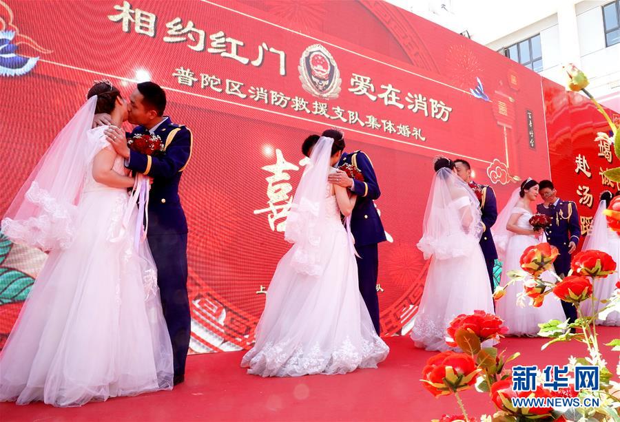 5月20日,几对新人在集体婚礼中接吻。 当日,上海市普陀区消防救援支队举行“相约红门,爱在消防”集体婚礼,8对新人参加。 新华社记者 陈飞 摄