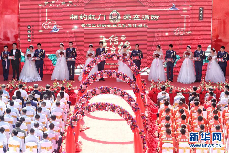 这是5月20日拍摄的消防员的集体婚礼。 当日,上海市普陀区消防救援支队举行“相约红门,爱在消防”集体婚礼,8对新人参加。 新华社记者 陈飞 摄