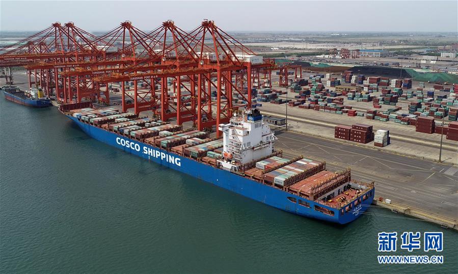 5月20日,轮船靠泊在唐山港京唐港区集装箱码头(无人机拍摄)。 记者从河北省唐山市海洋口岸和港航管理局获悉,今年前4个月唐山港货物吞吐量达2.12亿吨,同比增长11.42%。 新华社记者 杨世尧 摄