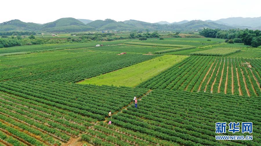 5月20日,在广西柳州市雒容镇坭桥村,村民在地里采摘辣椒(无人机拍摄)。 近日,广西柳州市雒容镇坭桥村2700多亩辣椒迎来丰收,农民在田间地头忙着采收辣椒。 新华社发(黎寒池 摄)