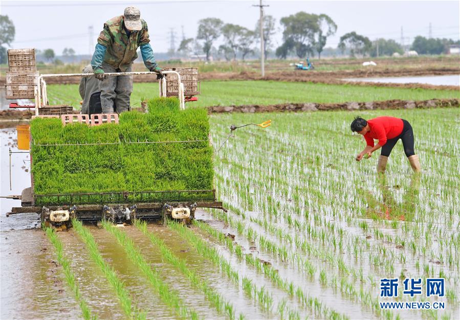 5月20日,唐山海港经济开发区王滩镇农民在田间插秧。 小满节气将至,河北省冀东地区唐山和秦皇岛水稻种植区农民抢抓农时,全面展开灌田、插秧,田间呈现出一派繁忙景象。 新华社记者 杨世尧 摄