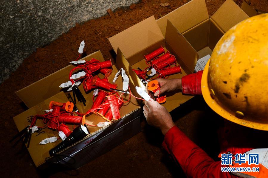 在格库铁路新疆段阿尔金山隧道内,爆破员鲁元国清点电子雷管装置(5月19日摄)。 新华社记者 丁磊 摄