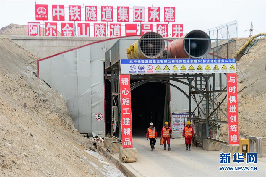 爆破工作结束后,爆破员鲁元国(中)和工友们走出阿尔金山隧道一号斜井(5月19日摄)。新华社记者 丁磊 摄