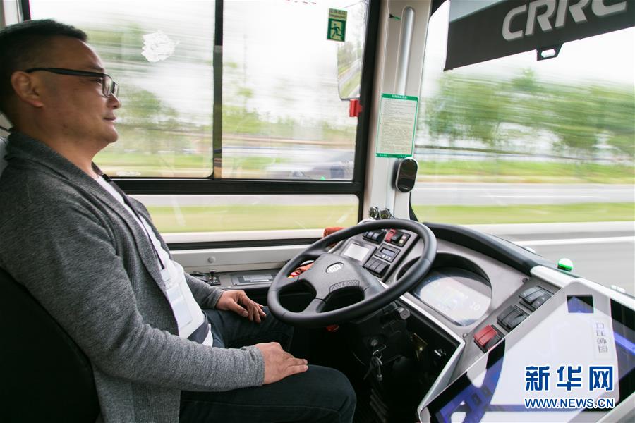 一辆无人驾驶公交车在国家智能网联汽车(长沙)测试区内行驶,驾驶座位的测试员关注路况和驾驶数据(4月28日摄)。 新华社发(陈思汗摄)