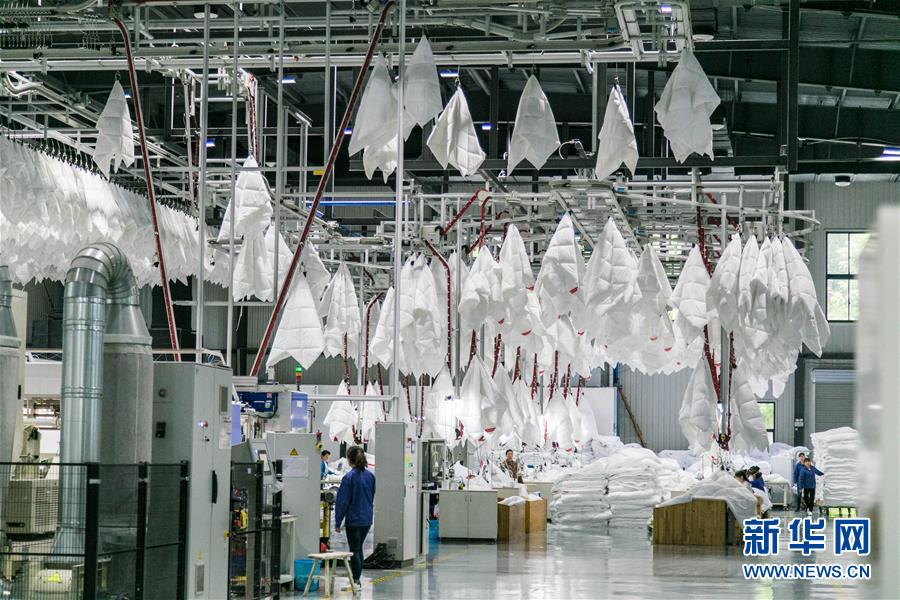 4月28日在湖南长沙拍摄的梦洁家纺智能生产线。 新华社发(陈思汗摄)
