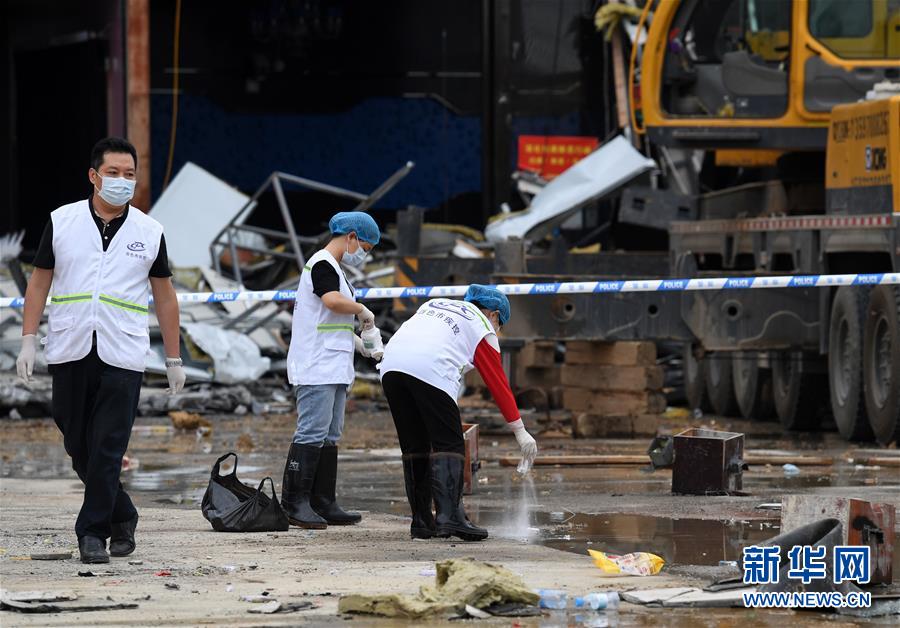5月21日,工作人员在事故现场进行卫生防疫工作。 记者从广西壮族自治区应急管理厅了解到,截至21日9时,百色一酒吧屋顶坍塌事故已造成4人死亡、87人受伤。经当地公安部门初步调查,7人因涉嫌工程重大安全事故罪被采取刑事拘留措施。 20日凌晨1时许,百色市右江区东州大道旁一家名为0776的酒吧发生钢架结构屋顶坍塌事故。 新华社记者 陆波岸 摄
