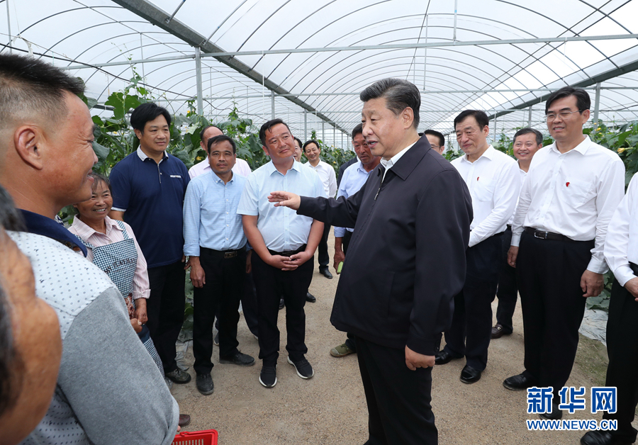 5月20日,中共中央总书记、国家主席、中央军委主席习近平深入赣南老区考察调研。这是习近平在江西省于都县梓山富硒蔬菜产业园同村民亲切交谈。 新华社记者 鞠鹏 摄