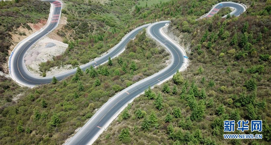这是分水岭上蜿蜒曲折的国道212线(5月21日无人机拍摄)。 海拔2980米的分水岭位于甘肃省定西市漳县和渭源县交界处,是黄河两大支流渭河水系和洮河水系的界岭,被当地人称为“山路十八弯”的国道212线蜿蜒其中,沿途景色怡人。 新华社记者 陈斌 摄