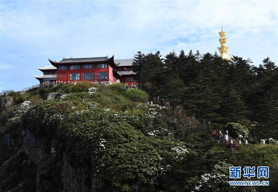 这是峨眉山金顶盛开的杜鹃花(5月21日摄)。 夏季里,四川省峨眉山景色秀丽,满山遍野的杜鹃花成为一道亮丽的风景。 新华社记者 杨宗友 摄