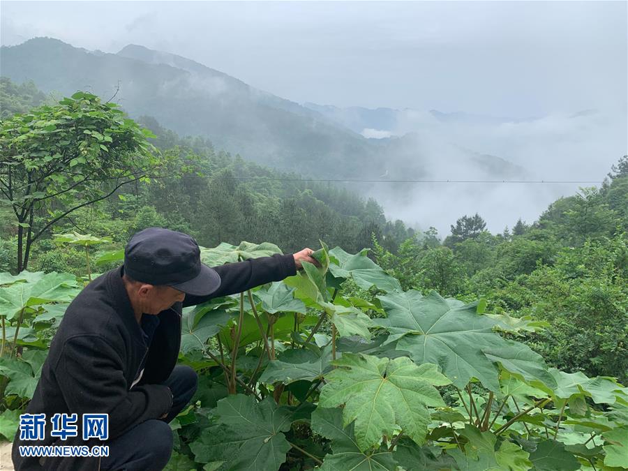 在湖南省湘西土家族苗族自治州保靖县碗米坡镇沙湾村,村委会主任何义国在一片栽植的通草前查看长势(5月20日摄)。 新华社记者 席敏 摄