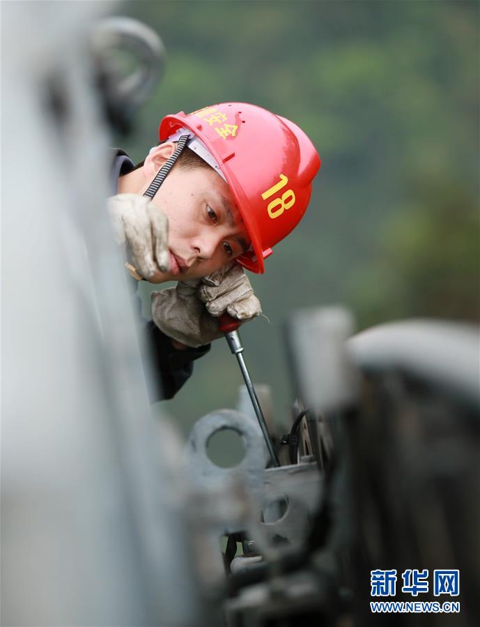 5月20日,谷和利在索道支架上检查运转轮运行情况。 新华社发(吴勇兵 摄)