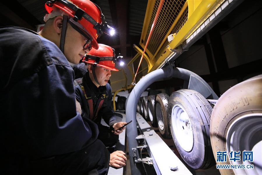 5月20日晚,谷和利(右)和同事在检修索道传输轮胎。 新华社发(吴勇兵 摄)