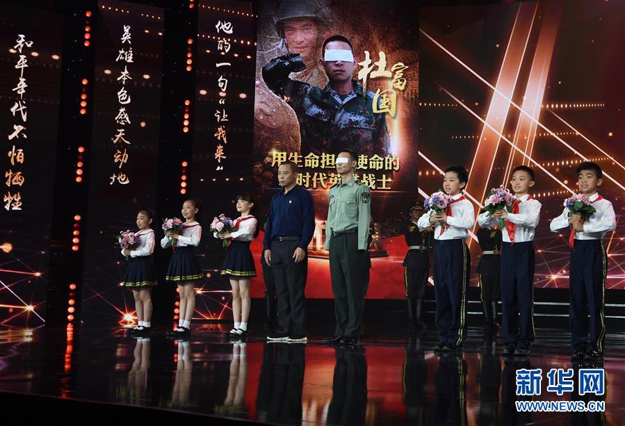 杜富国(右四)和父亲在“时代楷模”发布仪式现场(5月17日摄)。 新华社记者 张永进 摄