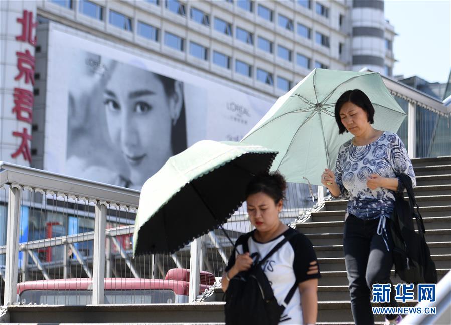 5月22日,行人用遮阳伞遮挡阳光。 北京市气象台于5月21日发布高温黄色预警,22-25日北京市将持续出现高温天气。 新华社记者 张晨霖 摄