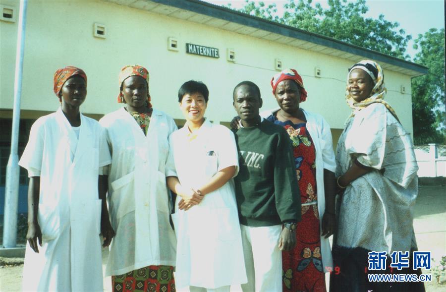 刘桂芝(左三)在喀麦隆参加援非医疗队期间与当地医护人员合影(资料照片)。 新华社发