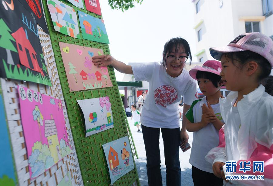 5月22日,孩子们在老师的带领下观看剪纸作品展。 当日,浙江省长兴县李家巷镇中心幼儿园举办校园“纸玩节”,在园区内开设风筝、餐具、拎包、纸箱等不同的主题区,并准备不同的材料和设计玩法,让孩子们用亲手剪出来的剪纸制作手工艺品,感受“剪纸大乐园”的快乐。 新华社记者 徐昱 摄