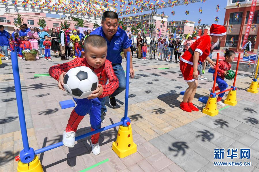 5月22日,万荣县六一幼儿园的小朋友和家长一起玩趣味游戏。新华社记者 曹阳 摄