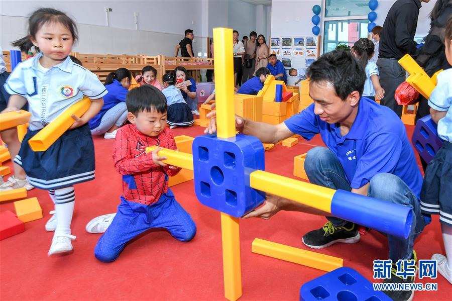 5月22日,万荣县六一幼儿园的小朋友和家长一起玩游戏。新华社记者 曹阳 摄
