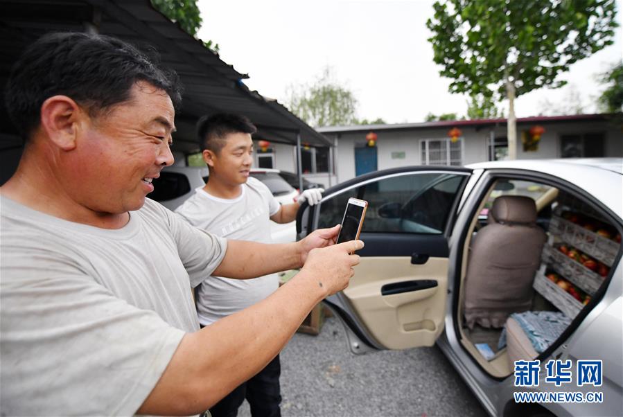5月22日,高青县魏寺村益丰蔬菜种植合作社成员张志正(左一)通过社交软件向客户推介自己种植的甜桃。 近日,山东省高青县魏寺村益丰蔬菜种植合作社的50个大棚内瓜果飘香、采摘繁忙,一派丰收景象。该合作社通过电商平台将生产的水果西红柿、西瓜、甜桃等优质果蔬销往北京、济南、淄博等城市,帮助社员实现增收。 新华社记者 朱峥摄