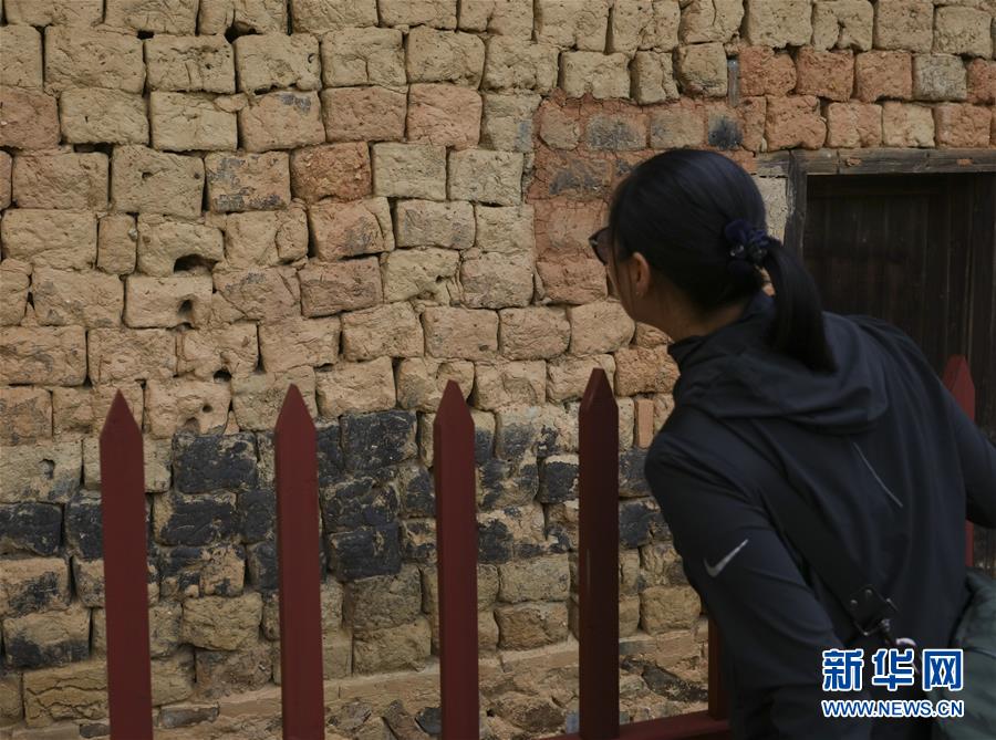 一名游客在观察江西省瑞金市红四军——柏地战斗战场遗址上存留的弹痕。1929年,红四军在该地伏击了国民党军刘士毅部,被陈毅称之为“红军成立以来的最有荣誉之战争”。1933年,毛泽东重过大柏地时,写下《菩萨蛮·大柏地》这一著名诗篇,诗词中著名的“弹洞前村壁”指的就是这座房屋的墙壁(5月7日摄)。 新华社记者 兰红光摄