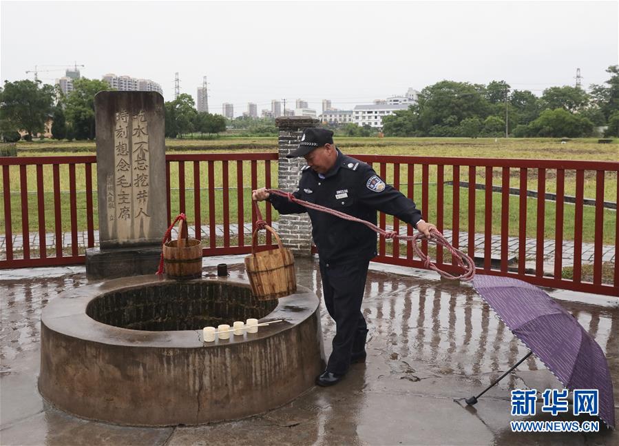 一位工作人员在江西瑞金市沙洲坝红井景区的红井旁为游客打水(5月6日摄)。 新华社记者 兰红光摄