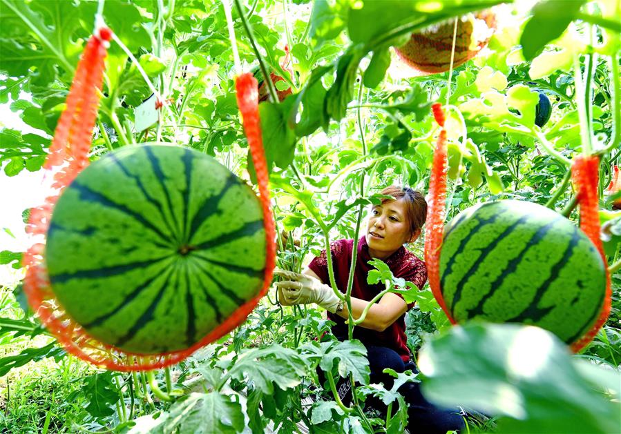 5月22日,工人在乐亭县乐亭镇独幽城村的一处现代农业示范园区的大棚内管理西瓜。 新华社记者杨世尧摄