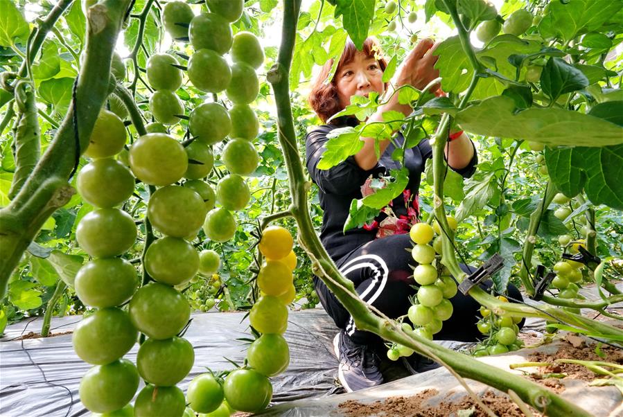5月22日,工人在乐亭县乐亭镇韩坨村的一处现代农业示范园区大棚内管理水果西红柿。 新华社记者杨世尧摄