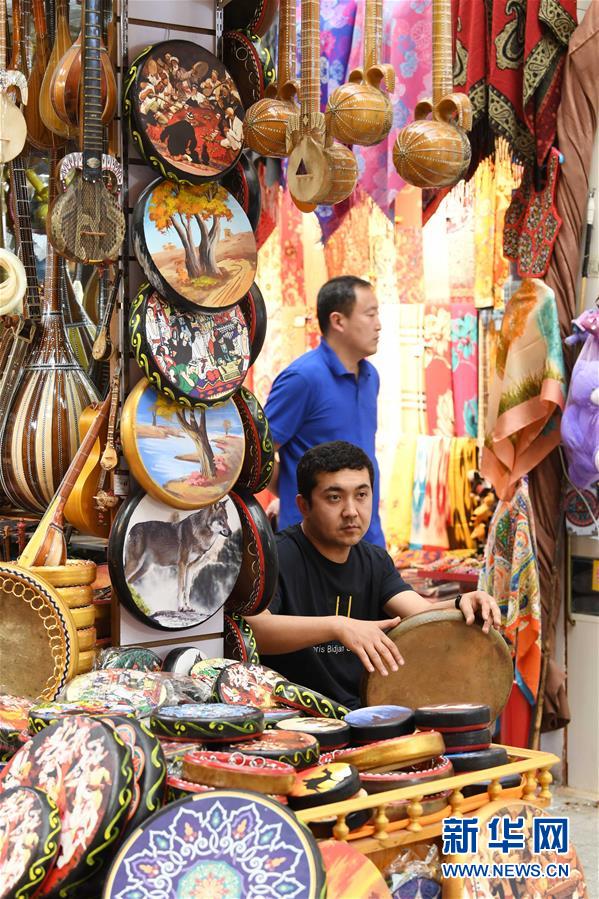 5月22日拍摄的乌鲁木齐国际大巴扎的商贩。 近日,新疆乌鲁木齐市国际大巴扎旅游逐渐升温,丰富的民族特色商品吸引了不少国内外游客。 新华社记者 贺灿铃 摄