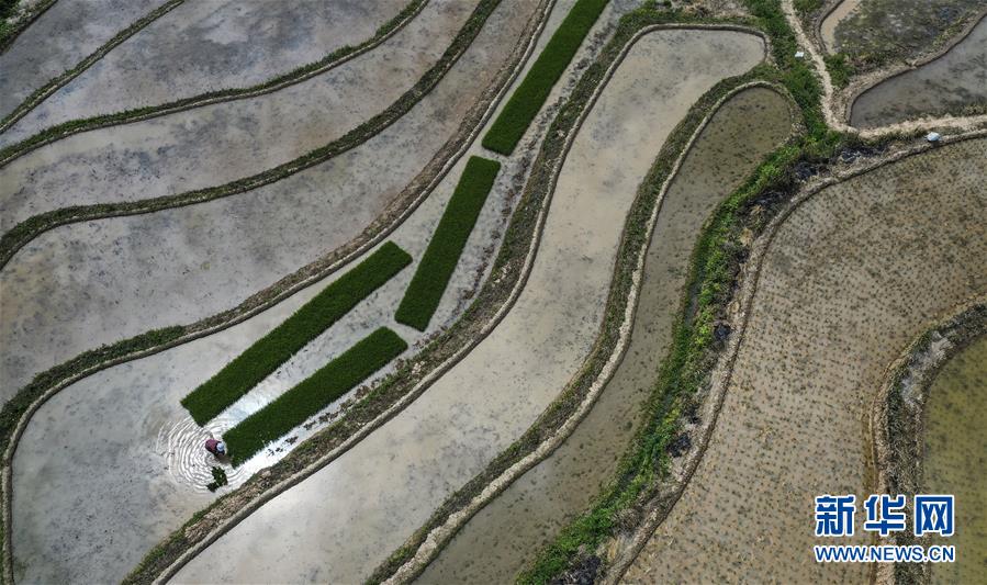 5月23日,黄柏塬镇皂角湾村村民在水田里整理秧苗(无人机拍摄)。 在秦岭主峰太白山南麓脚下的陕西省太白县黄柏塬镇,碧流穿峡,山青水秀,空气清新。这里保存着众多原生态的自然风貌,有“秦岭腹地小江南”之称,吸引游客前往探秘观光、休闲避暑。 新华社记者陶明摄