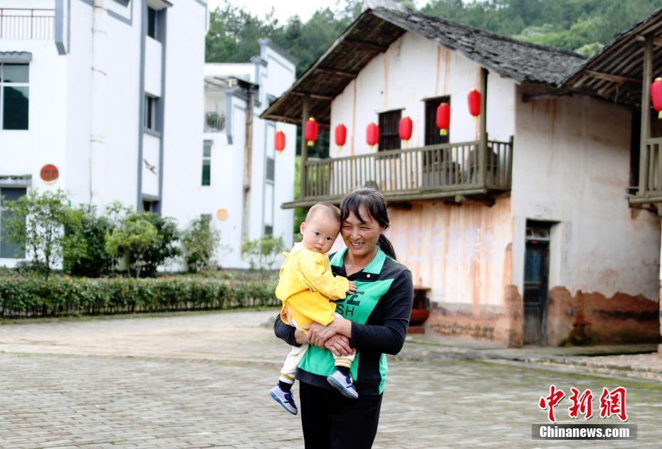 5月23日,在江西瑞金市叶坪乡黄沙村华屋,村民抱着小孩在新村旧屋前散步休闲。坐落于绿水青山中的华屋村,曾是一个贫困落后的小村落。在实施苏区振兴和精准扶贫后,这里的村庄发生了翻天覆地的变化,不仅新修建了公路和住房,并统一规划建设了大规模的蔬果大棚,成为是远近闻名的乡村旅游点。中新社记者 刘占昆 摄