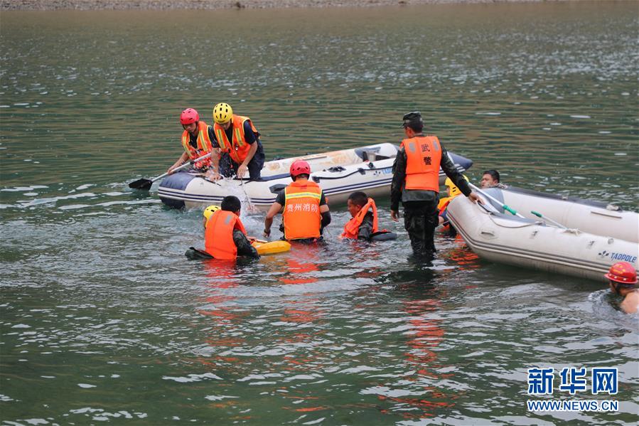 5月24日,救援人员驾驶冲锋舟在河上搜寻打捞。 截至24日14时,贵州省贞丰县船只侧翻事故已造成10人死亡,仍有8人失联。包括船主在内已有11人获救,伤员均在医院救治。目前涉事船主已被警方控制。 5月23日18时30分左右,贵州省黔西南州贞丰县鲁容乡板绕村北盘江流域坝油段,一艘载有29人的农户生产生活自用船发生侧翻。据初步了解,该船为非营运的动力驱动铁皮船,核载5人,实载29人。目前,现场搜救及调查善后等工作仍在进行中。 新华社发(丁居聪 摄)