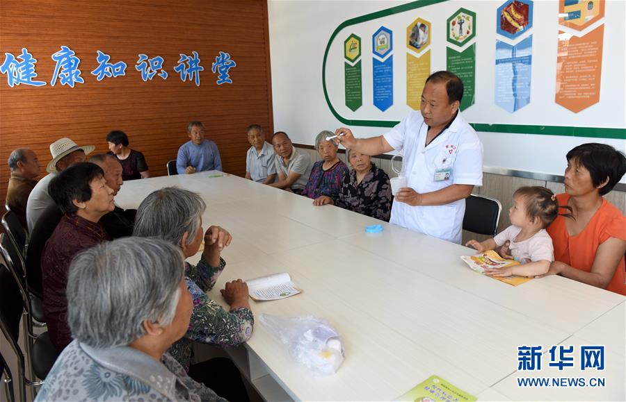 5月24日,在南和县贾宋镇北师村“健康大院”内,医护人员为村民讲解保健常识。 近年来,河北省南和县不断推进医疗资源向基层下沉,加强村级卫生服务建设,在全县20个村试点设立“健康大院”,由乡镇卫生院医护人员组成的医疗团队定期进驻“健康大院”,为群众提供健康诊疗、康复咨询和慢性病防控等服务,受到群众欢迎。 新华社记者 朱旭东 摄