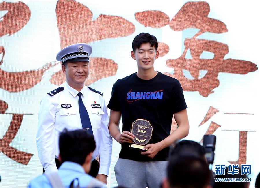 5月24日,上海上港足球俱乐部球员颜骏凌(右)在交通安全宣传日活动上被授予“上海市道路交通安全宣传大使”称号。 当日,由上海市公安局交通警察总队联合上海市精神文明建设委员会办公室等单位举办的2019年上海市“无违法、无事故”交通安全宣传日活动在长宁区举行。 新华社记者 凡军 摄