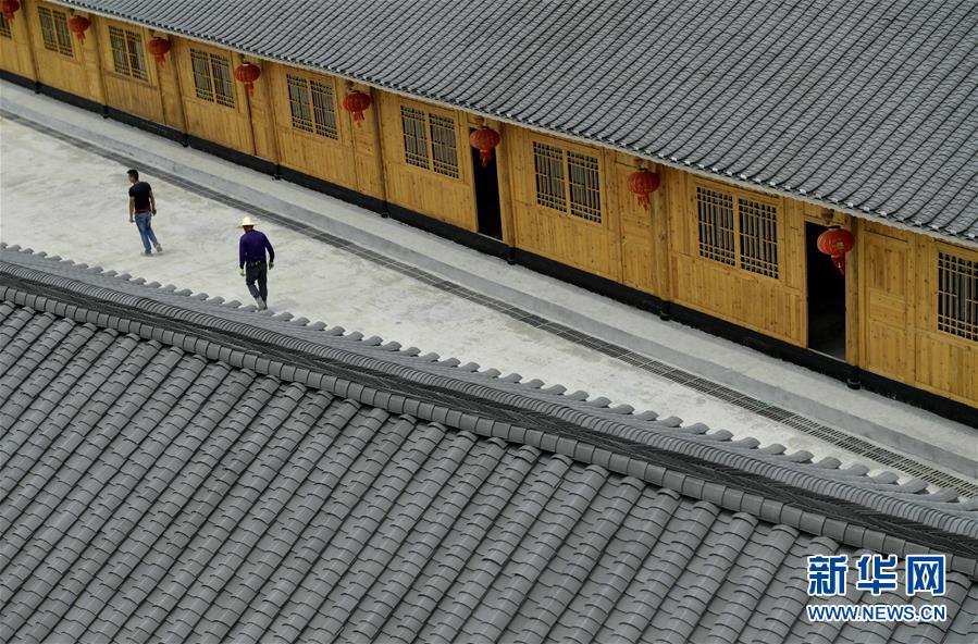 5月24日,搬迁农民走在崭新的“侗族大院”里。 新华社发(宋文 摄)