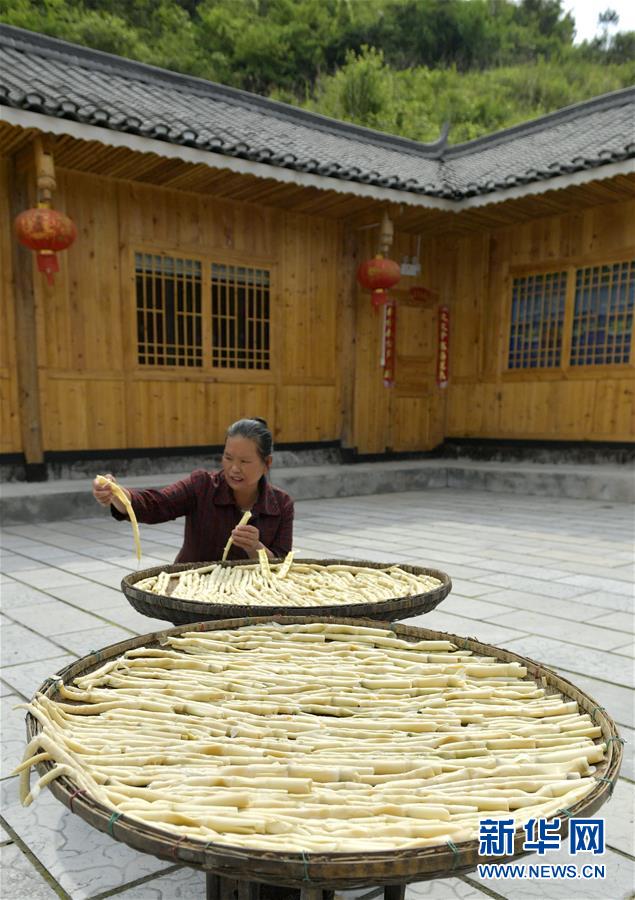 5月24日,搬迁农民在崭新的“侗族大院”里晾晒竹笋。 新华社发(宋文 摄)