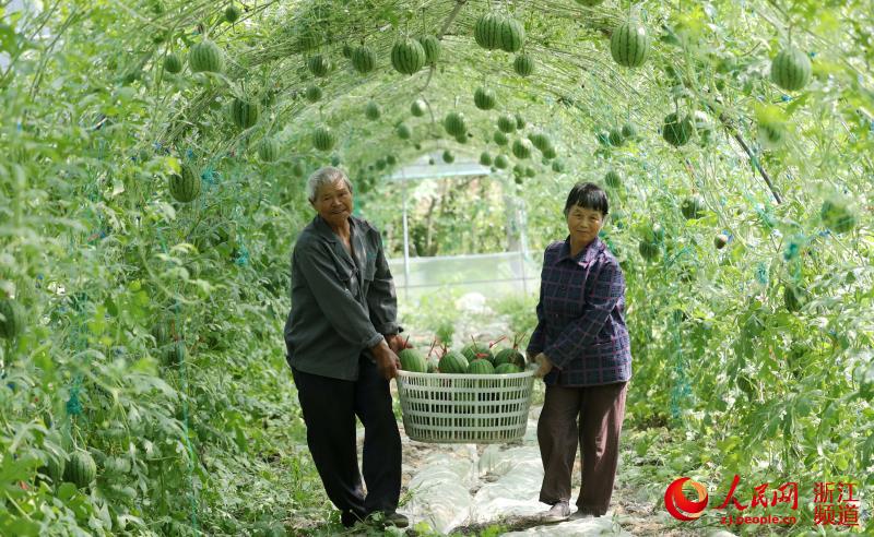 人民网湖州5月26日电 24日,浙江省湖州市德清县乾元镇新田瓜蔬基地种植的“空中西瓜”喜获丰收,瓜农忙着采摘。该基地采用网架栽培技术种植的西瓜,光照均匀充足,品质和产量得到提高,也节省了大量劳动力成本。