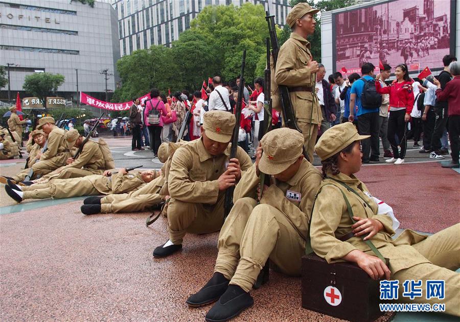 5月26日,在上海南京东路步行街世纪广场,来自上海文艺界的百余名艺术家和演员重现中国人民解放军解放上海露宿街头的感人一幕,以纪念上海解放70周年。 新华社记者任珑摄