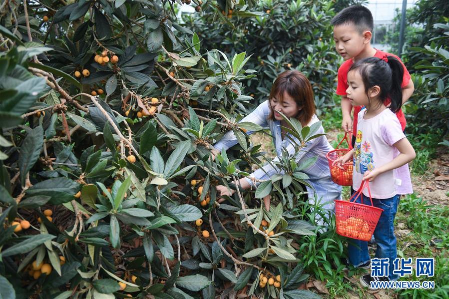 5月26日,游客在林城镇上狮村的枇杷种植园内采摘枇杷。 初夏时节,浙江省长兴县林城镇多个乡村的生态果园迎来了“水果采摘季”。近年来,长兴县林城镇大力推动水果种植业,目前生态水果种植面积4000多亩。当地乡村采摘游从5月一直延续到9月,采摘品种包括樱桃、枇杷、蓝莓、水蜜桃等,成为当地美丽乡村的旅游“金名片”。 新华社记者 徐昱 摄
